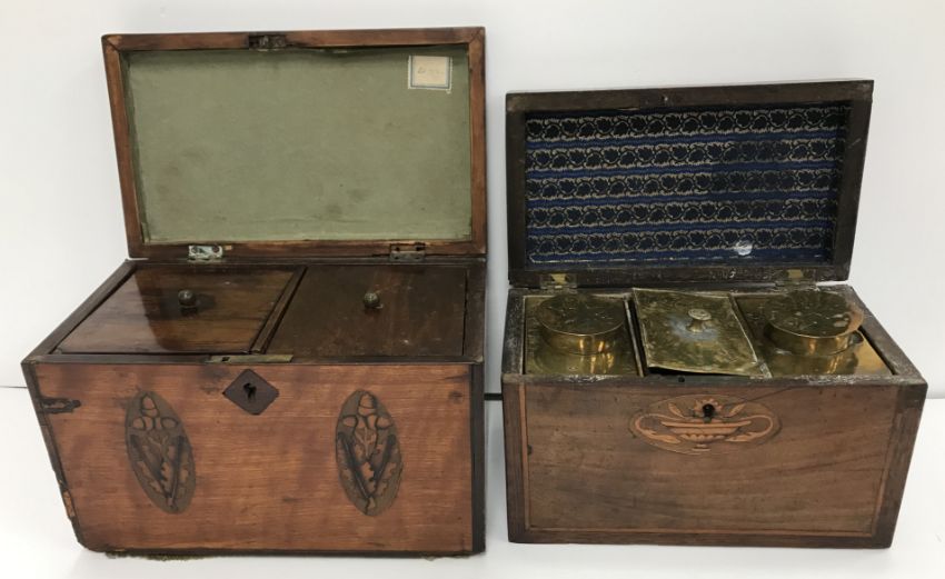 A George III mahogany and shell marquetry inlaid rectangular tea caddy, the top opening to reveal three brass canisters 18.5 cm wide x 10.5 cm deep x 12 cm high together with a late George III mahogany tea caddy with shell marquetry inlaid medallion decoration to the lid opening to reveal two lidded compartments over an oak leaf and acorn medallion decorated front panel 20.5 cm wide x 12 cm deep x 13.5 cm high