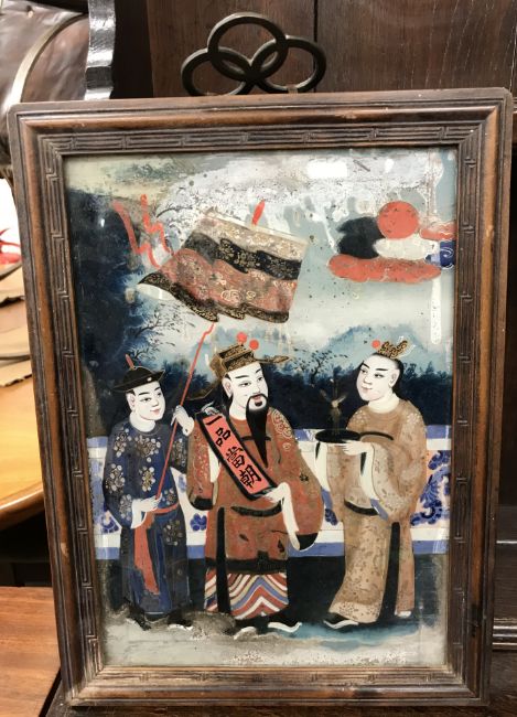 19TH CENTURY CHINESE SCHOOL "Study of three figures on a veranda" reverse painted on glass, 30 cm x 20.5 cm
