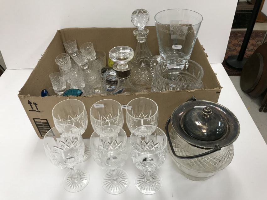 A collection of cut and other glassware including six Stuart crystal wines, ship's decanter with silver rim, presentation goblet of bucket form inscribed "Presented to E. KT Noel Parkinson by His Brother Knights of the Sussex Preceptory No. 125 with gratitude October 2nd 1997", cut glass water jug, cut glass decanter and stopper, Edinburgh crystal tumblers, Mdina glass jug and paperweight, four various other paperweights, Edinburgh crystal liqueur glasses, two glass inkwells and pen stand and a cut glass biscuit barrel with plated mounts
