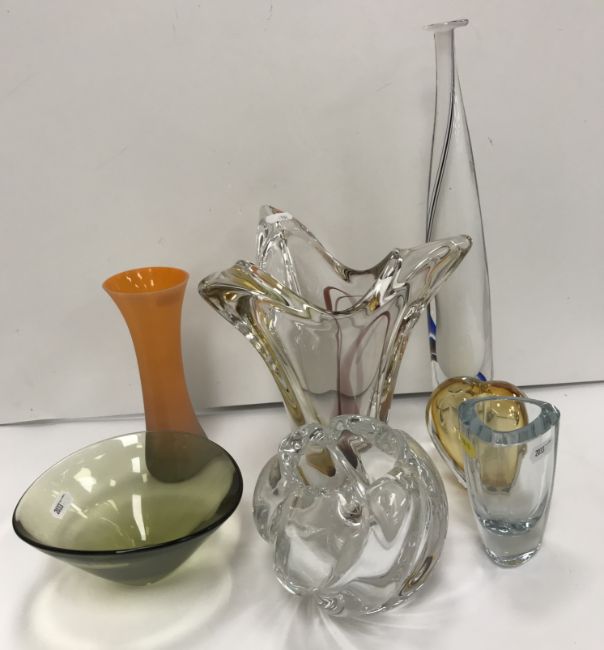 A collection of studio / art glass vases to include a Klas-Goran Tinback for Kostaboda slender vase, circa 1976-81, with striped and dot swirling decoration on a white ground, 38 cm high, a Max Verboeket tri-form vase with burgundy swirl stripe decoration, 24 cm high, a Holmgaard pale green bowl, 17 cm diameter x 8 cm high, an Orrefors clear glass swirl spherical vase, 11.5 cm high and three others various