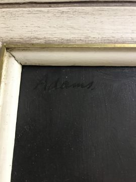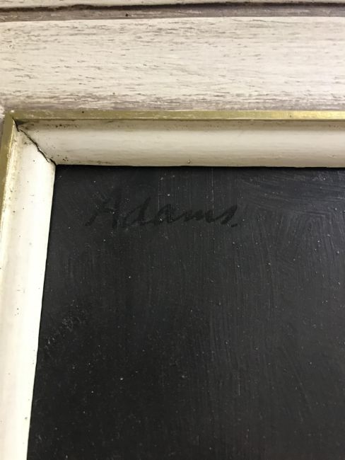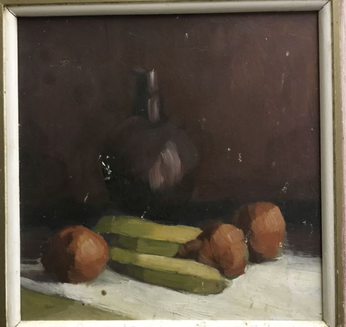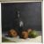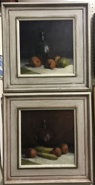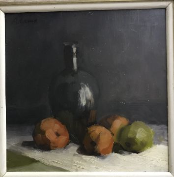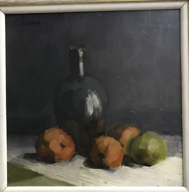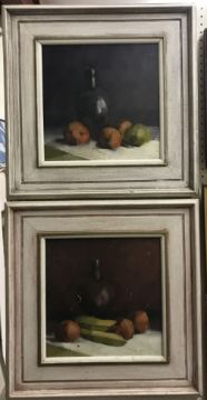 ADAMS "Still life" study of wine bottle and fruit on a ledge, oil on board, signed top right, 31.5 cm x 31.5 cm together with another similar, unsigned, 30 cm x 30 cm (2)