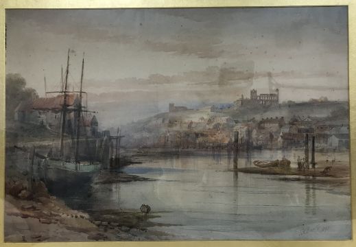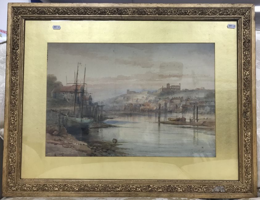 FREDERICK WILLIAM BOOTY (1840-1924) " Whitby with the abbey in the distance", river landscape with boats and fishermen in foreground and ruined castle in background, watercolour, signed and dated 1899 lower right, 35.5 cm x 52 cm