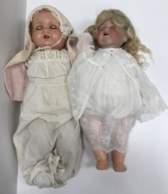 An Armand Marseille bisque headed doll, model No."996", stamped "Koppelsdorf Germany 996-A9M", composition jointed body, sleep eyes, open mouth with teeth, approx 52 cm high and an Armand Marseille composition headed doll stamped "AM Germany" to back of head, approx 54 cm high together with a felt covered soft "Golly" toy, 57 cm high and a Pedigree gold plush dog figure, 27 cm high  Notice from the the-saleroom.com: These items are listed on the basis they are illustrative of a bygone culture in which there were different social norms. We understand the potential controversy surrounding this type of item but believe that providing transparent information about historical context fosters greater understanding of our complex cultural history.