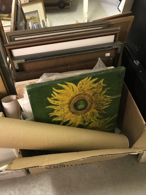 A large collection of assorted decorative pictures, prints, art portfolios, etc. to include M A GRIFFIN "Winter roses", still life study in pastel, inscribed with title and date verso, 24.5 cm x 32 cm, 19TH CENTURY ENGLISH SCHOOL "Study of a parlour with cat in foreground", watercolour, unsigned, 17.5 cm x 20 cm, G ORME "Street scene with mountains mid ground", watercolour, signed and dated 26 lower right, 21.5 cm x 20.5 cm and 20TH CENTURY SCHOOL "Study of a mask", colour print, 30 cm x 20 cm, together with four boxes of paintings and prints various