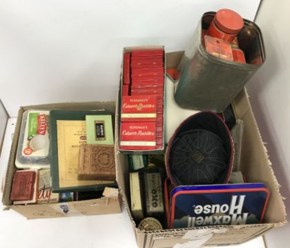A box containing assorted sundry games and toys to include card games, solitaire, "Rafie's Rollicking Trip to Berlin" etc together with a box of assorted vintage tins etc (2 boxes) plus a metal shoe last etc