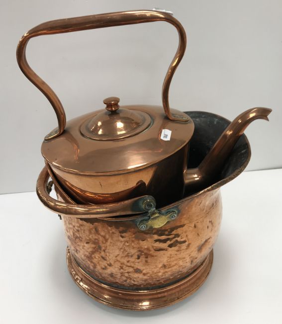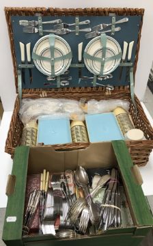 A Sirram picnic set together with a copper coal helmet and copper kettle and a quantity of various plated and other cutlery