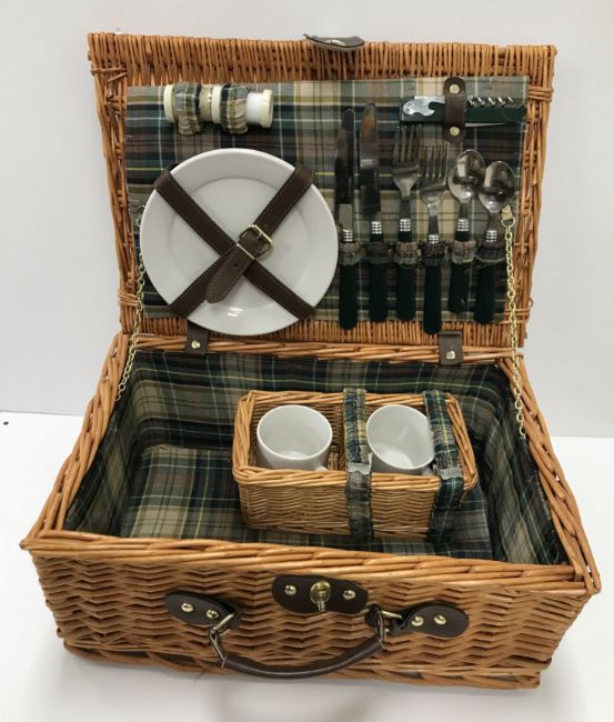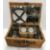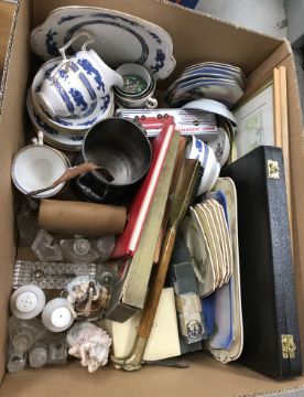 A box containing assorted decorative china ware to include Crown Staffordshire "Blue Dragon", various glass cruets, small stamp album, Seiko watch in fitted box, together with a wicker fitted picnic hamper (1 box and a hamper)