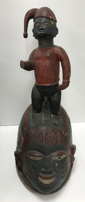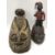 Two wooden painted African masks, each depicting figure on a face together with Oriental hat with beaded decoration