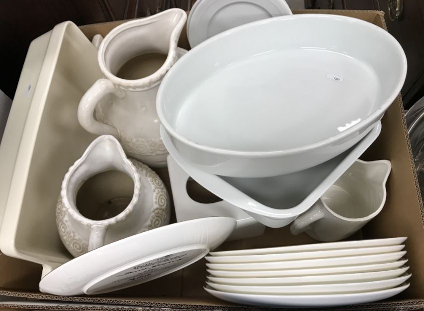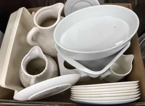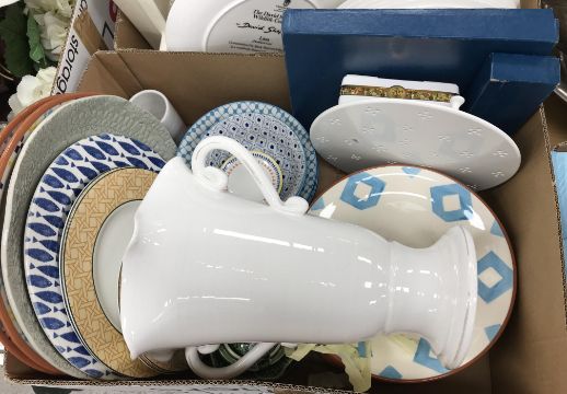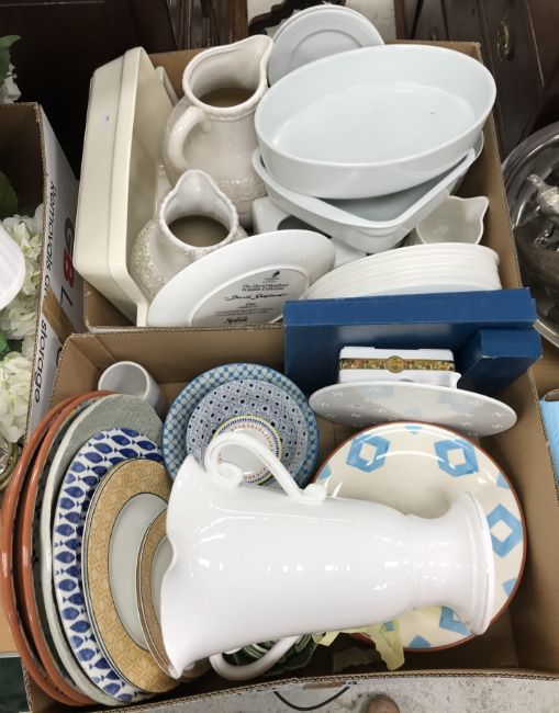 Two boxes of modern household china wares to include John Lewis and a set of Wedgwood David Shepherd Wildlife Collection collectors plates etc