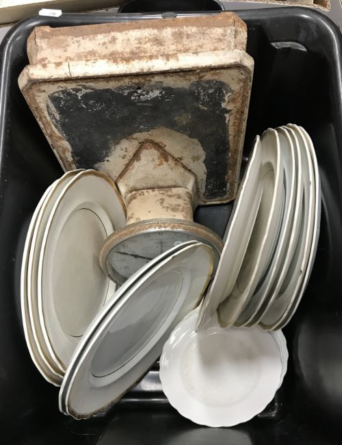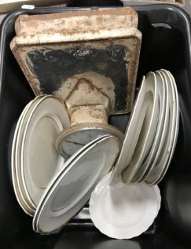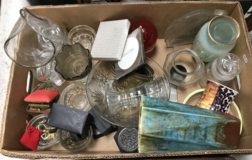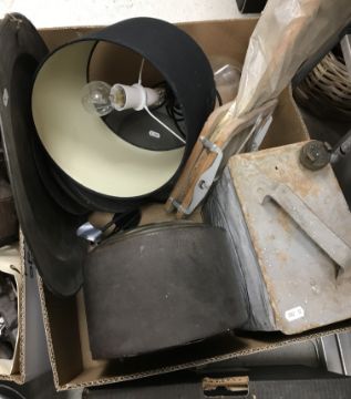 Four boxes of sundry items to includ pewter plates, Esso jerry can, assorted china wares, barometer, binoculars, set of scales, various records, etc. together with a box containing assorted vintage slides and a suitcase containing a slide projector, assorted glassware, etc. (7 boxes / cases)