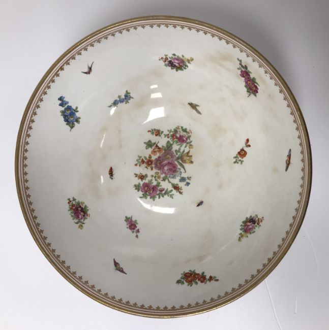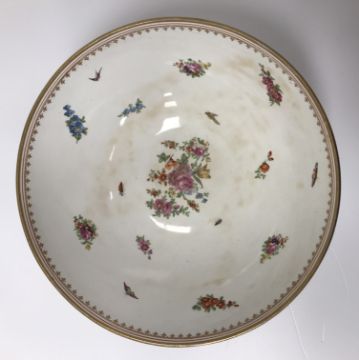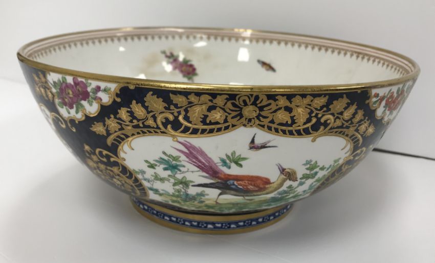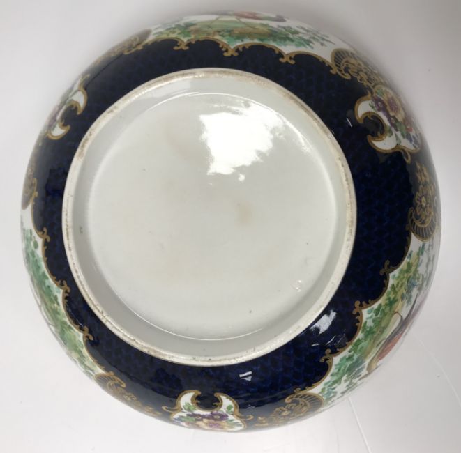 An early 20th Century Worcester style fruit bowl decorated in the 18th Century manner with panels of exotic birds printed and over coloured within a blue scale ground with gilt foliate decoration, the interior decorated with floral sprays, butterflies, birds and insects, 24.8 cm diameter x 108 cm high