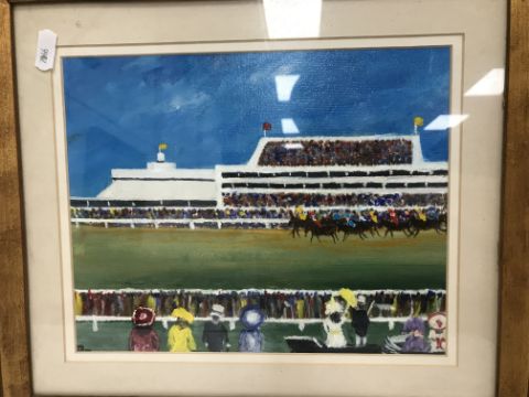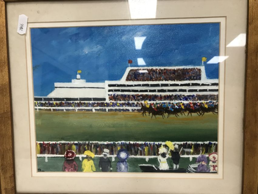 An Ernst Wahliss Alexandra Porcelain Works Turn "Vienna" coffee set comprising six coffee cans, two matching saucers, three smaller saucers, water jug and sugar bowl and cover together with a small quantity of various other china wares and a pair of plated sugar nips together with a framed and glazed oil on board study of Ascot Races, indistinctly initialled lower left 25 cm x 20 cm