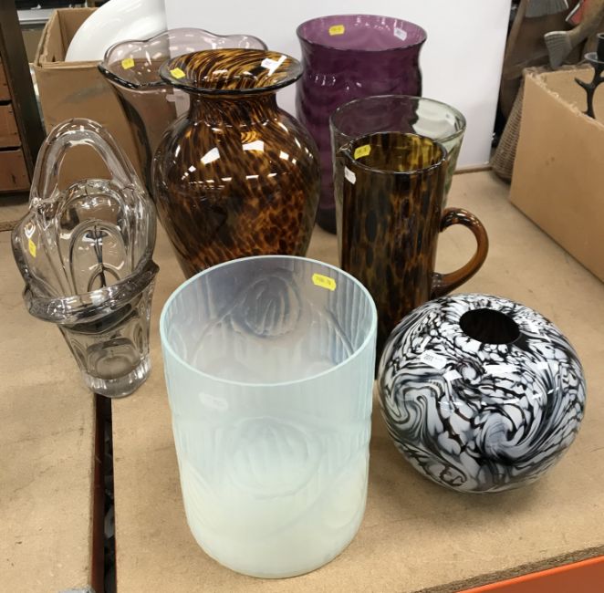 A Lalique style opalescent cyclindrical vase with faceted fruit decoration 22.5 cm high x 17.5 cm diameter, a black and white swirl decorated globular vase bearing moulded "K" mark to base, 17 cm high, a Ralf Lauren "Tortoiseshell" jug, 27 cm high, another tortoiseshell vase, 33.5 cm high, a Whitefriars type pale green goblet vase, 25 cm high, an amethyst glass vase, 31 cm high, a smoked glass flower head vase, 29 cm high and a clear glass Studio type vase, 24 cm high x 40 cm wide