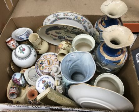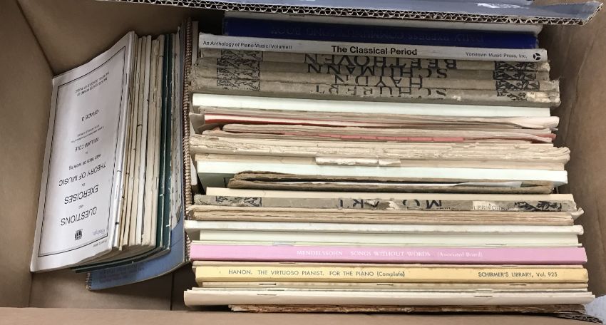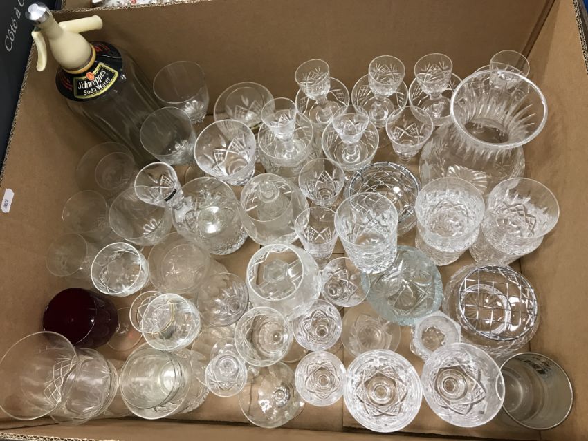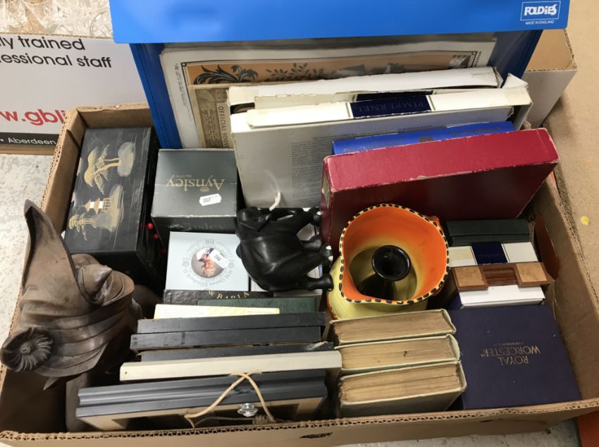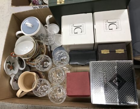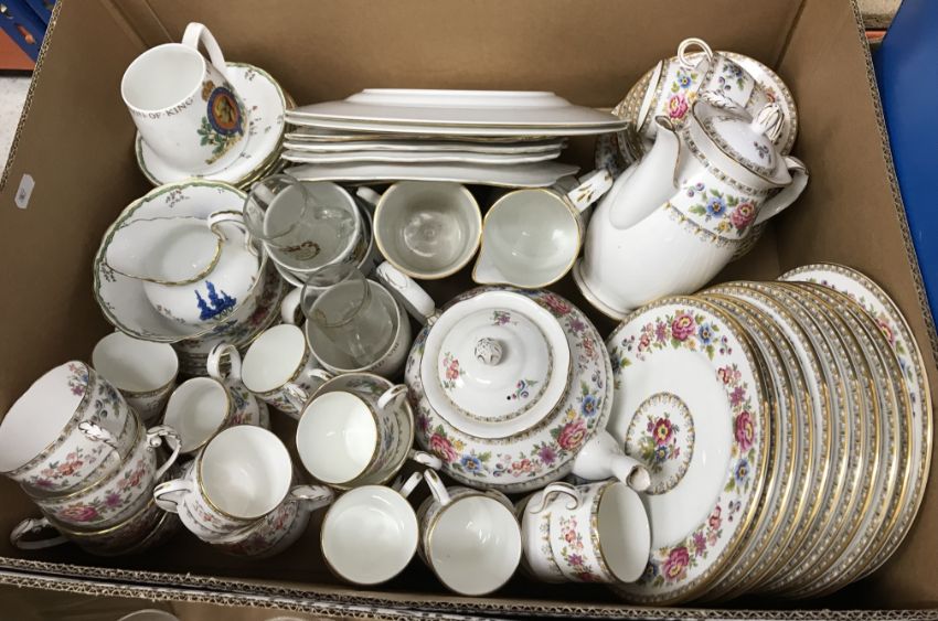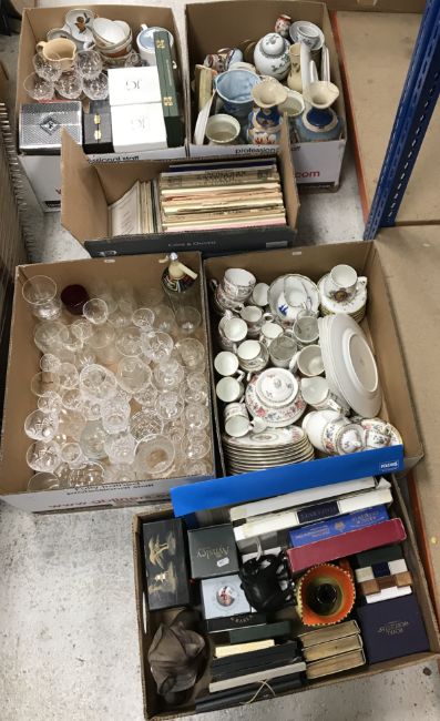 Three boxes of assorted decorative china wares to include a Susie Cooper "Glen Mist" part coffee set, a Royal Grafton "Malvern" part tea set, a Tuscan China floral decorated part tea set, a cased Spode limited edition "Gloucester Regiment" plate, together with a box of assorted glassware, a box containing assorted music and a box containing assorted miscellaneous items to include coasters, pictures, etc, (6 boxes)
