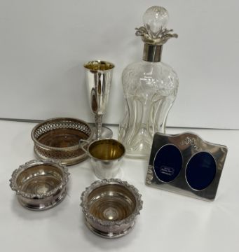 A silver mounted glug glug decanter (by Walker & Hall, Sheffield 1907) together with a small silver beaker with gilded interior, weighable silver 1.5 oz, a modern silver twin photo frame, a pair of plated miniature wine coasters and a further wine coaster and a commemorative plated goblet inscribed "First prize Wentworth 1993" stamped to base "John Donald London"