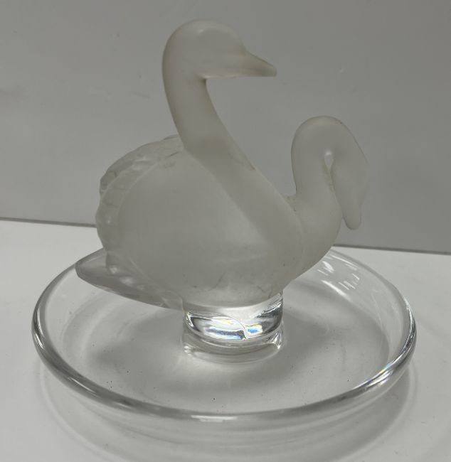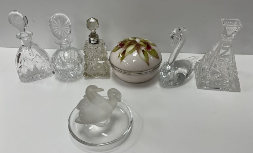 A small collection of glassware to include a Lalique pin dish of two swans, 9 cm high x 10 cm diameter together with four cut glass scent/perfume bottles including one by Galway, a model glass swan indistinctly marked to base with a lion's head and wording and a modern enamel decorated jewellery box