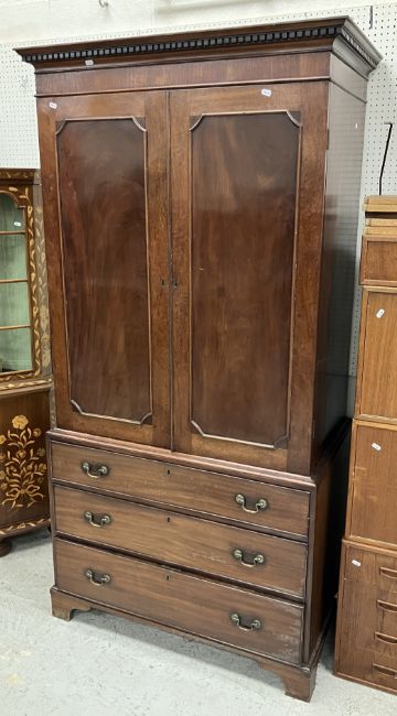 A circa 1900 mahogany linen press/wardrobe of small proportions, the moulded dentil cornice over two panel doors enclosing a hanging space and two shelves over three long graduated drawers with brass swan neck handles raised on bracket feet, 99 cm wide x 57 cm deep x 197 cm high