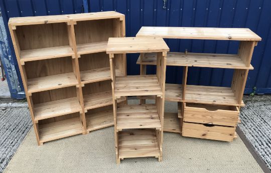 Three various modern pine shelf units, 100 cm x 103.5 cm x 38 cm, 104 cm x 38 cm x 44 cm and 95 cm x 118 cm x 30.5 cm
