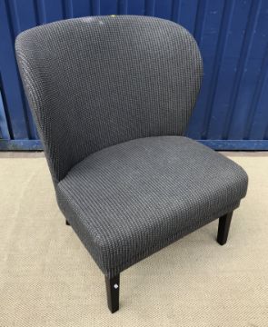 A Wesley Barrell Huntley red/brown leather upholstered scroll arm chair on square tapered legs, 78 cm wide x 76 cm deep x 86 cm high together with a modern upholstered bow back snuggler type chair on square tapered legs, 81 cm wide x 75 cm deep x 100 cm high