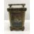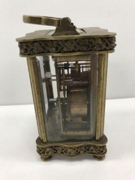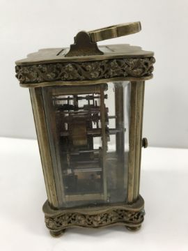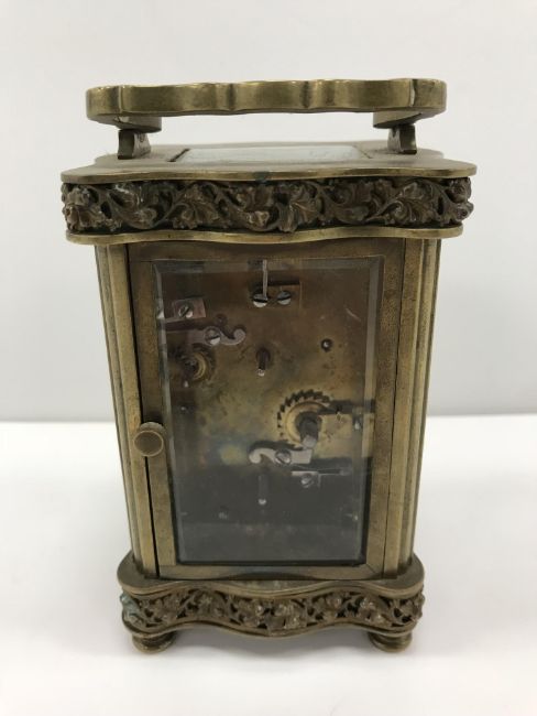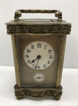 A late 19th Century French brass cased carriage clock, with serpentine banded relief work, grape and vine decoration, the circular porcelain dial with Arabic numerals over a further dial for the alarm, with bell to underside, raised on turned feet, 12 cm high not including folding handle