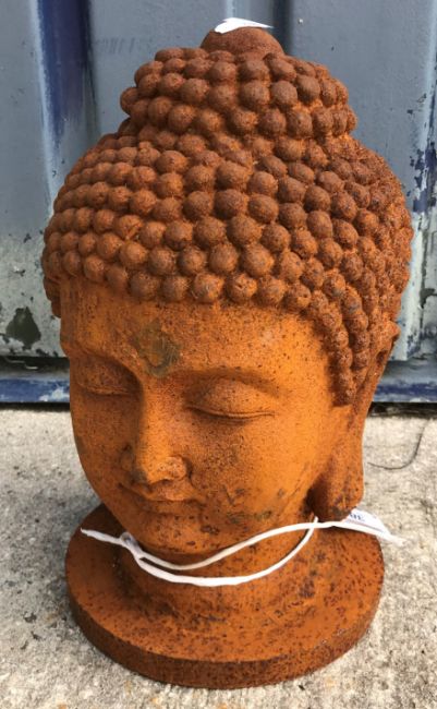 A cast metal figure of a Buddha's head, with rust style patination, 32 cm high