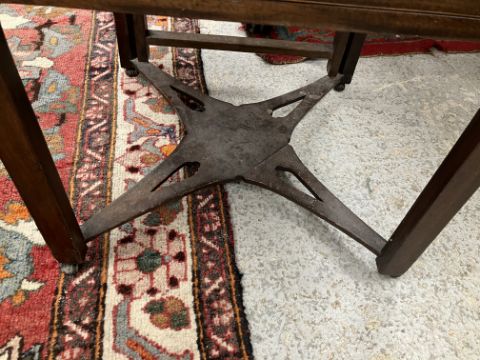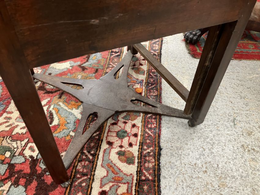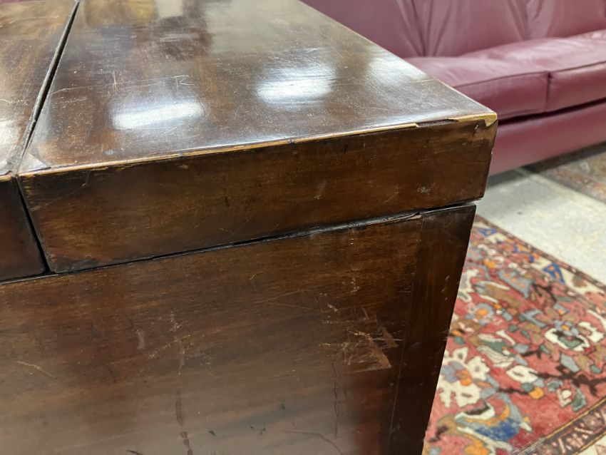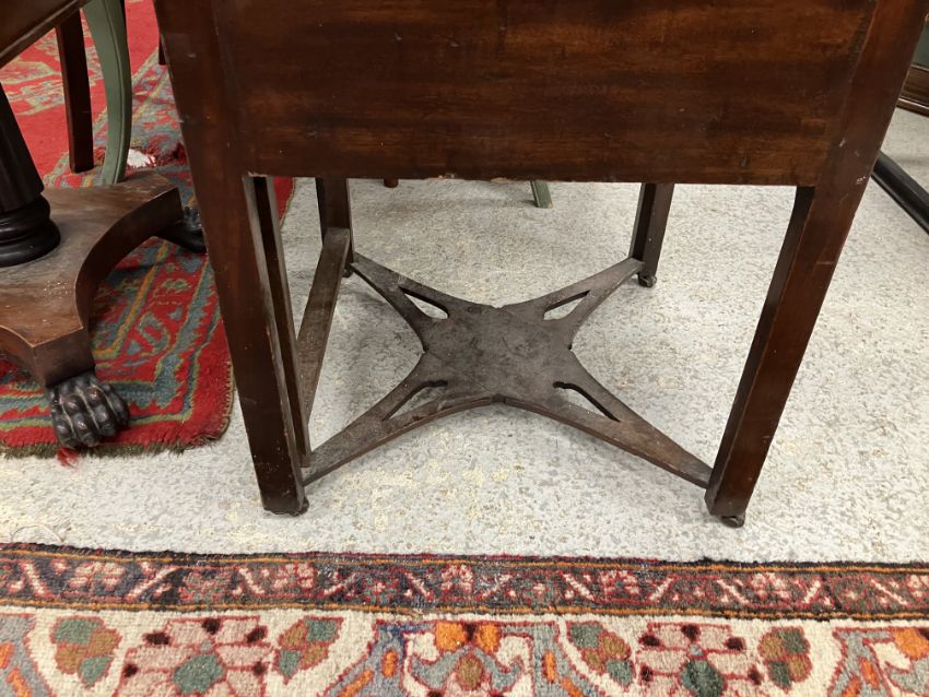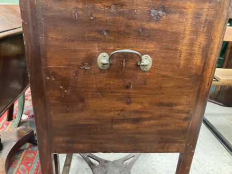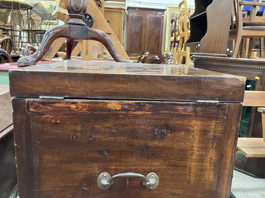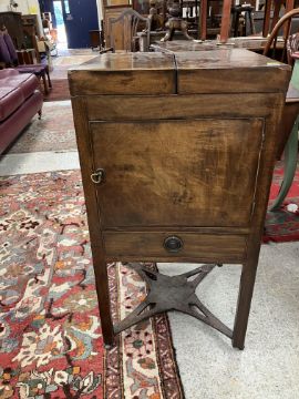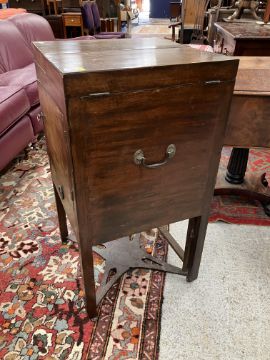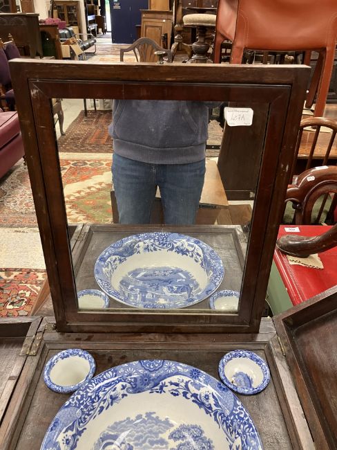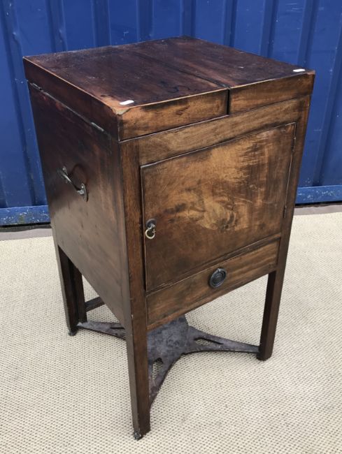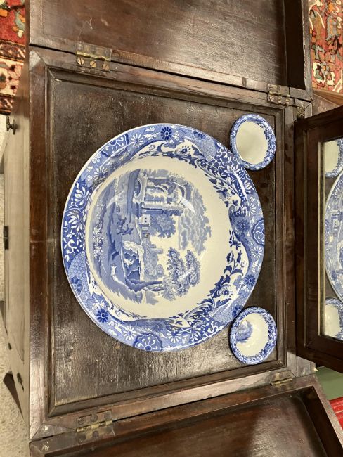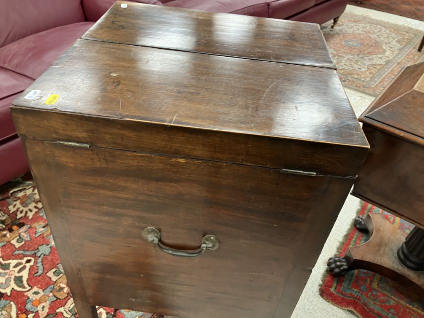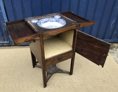 A 19th Century mahogany washstand, the double rising lid opening to reveal a fitted interior with rising mirror and Copeland Spode "Italian" blue and white wash bowl, soap dish and brush bowl, over a cupboard drawer and door, on square chamfered supports united by a pierced X stretcher, 45.5 cm wide x 45.5 cm deep x 85 cm high (closed), together with a Victorian mahogany torchere stand, the circular dished top on a reeded and lotus leaf carved pedestal to cabriole tripod base and pad feet, 26 cm diameter x 124 cm high
