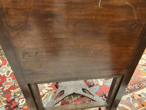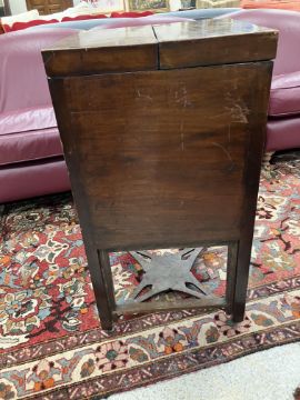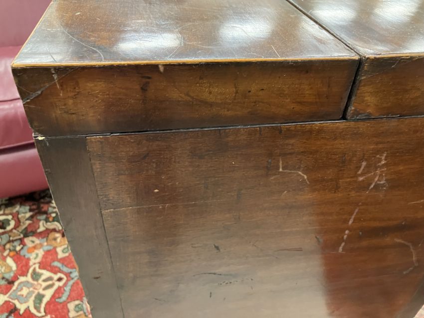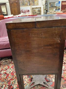 Has various heavy stains throughout and losses to the stringing throughout. Has had some significant and large repairs, particularly to the left hand side panel at the top and the door on the right hand side. The mirror mechanism is awkward but working. Otherwise heavy wear and tear conducive with age and use. See images for further dfetail.