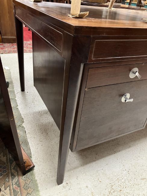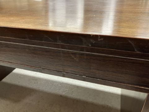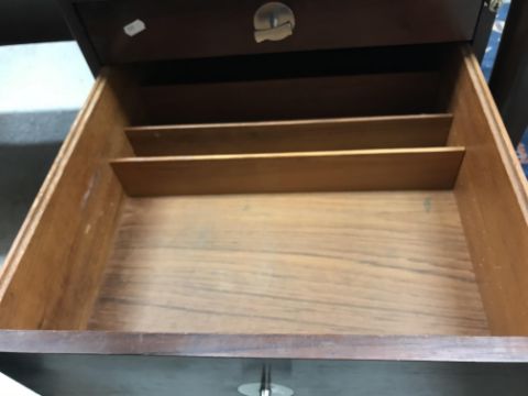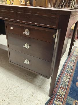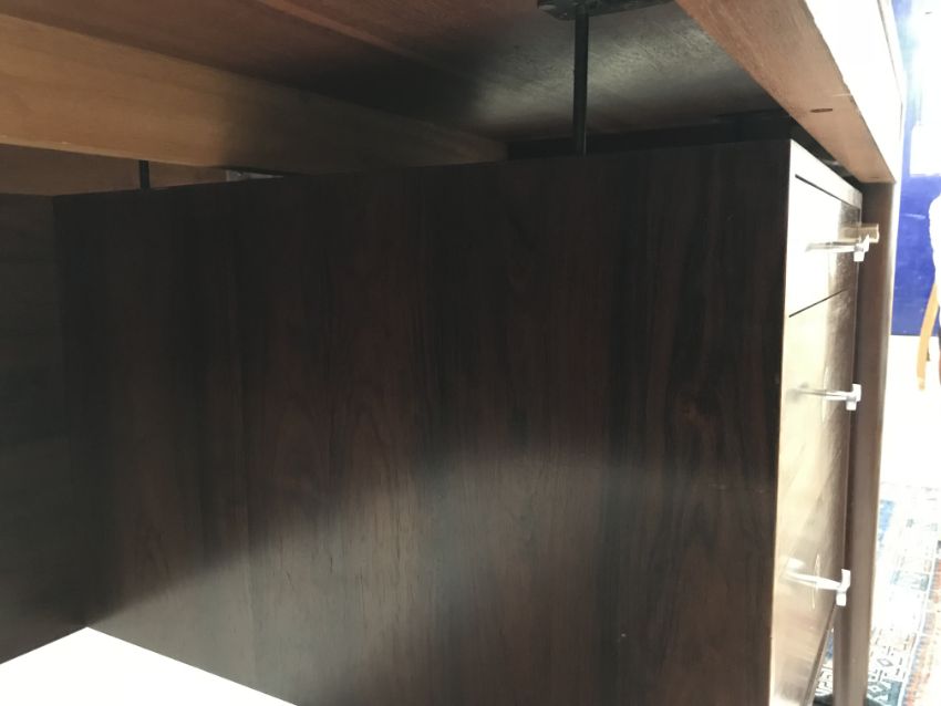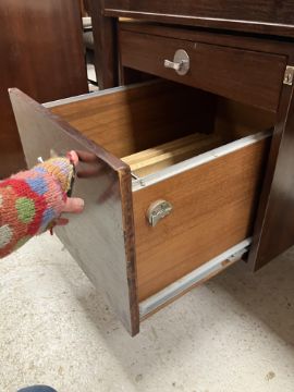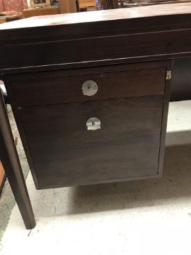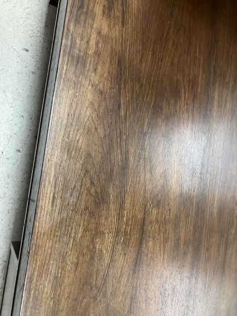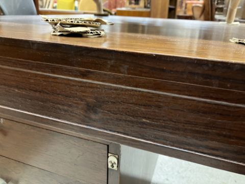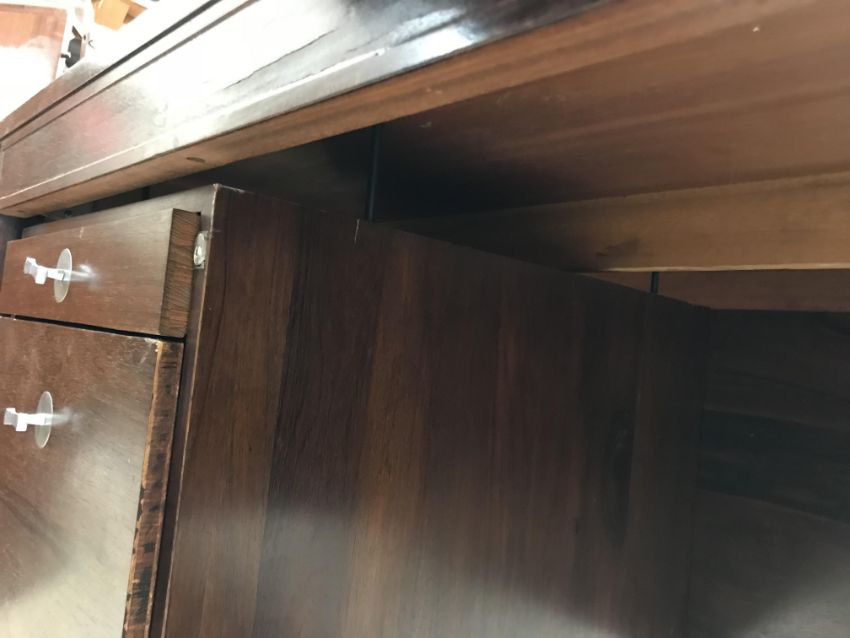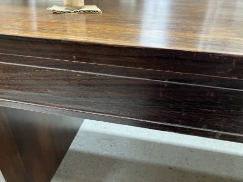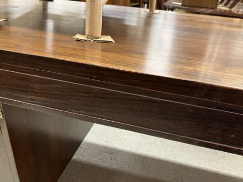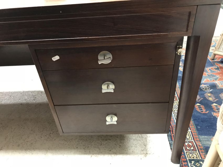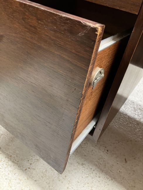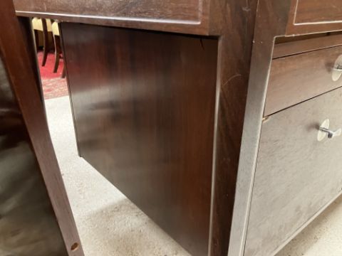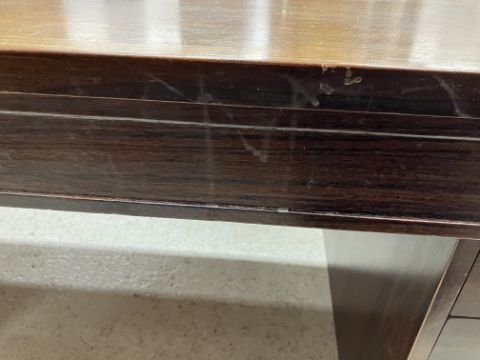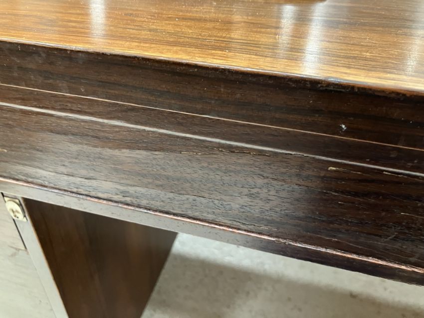 There is significant fading to the top as well as various areas of water marks. One back corner has a large chunk of veneer missing and to the upright of the leg. Another has a small chip missing. Looks as though someone has tried to polish the top at some point - badly as it has wire wool scratch like marks in it. No keys present for the lock. One of the file hanging drawers - the cornice has significant knocks / bruises and needs a little tlc on installing the drawer properly. A couple of the handles are slightly askew. The metal work is in need of a clean. Otherwise general wear and tear conducive with age and use to include knocks, bumps, etc. throughout. Has clearly been used as an office desk for some time. Desk is slightly wobbly - possibly needs joints tightening up a bit. There are some splits to the veneer on the front apron on the left hand side just after the drawers towards the middle and there is a split to the wood on the left hand side where the on pressure from the support post has come through. See images for further details.