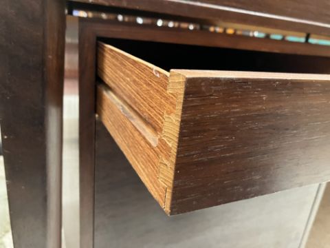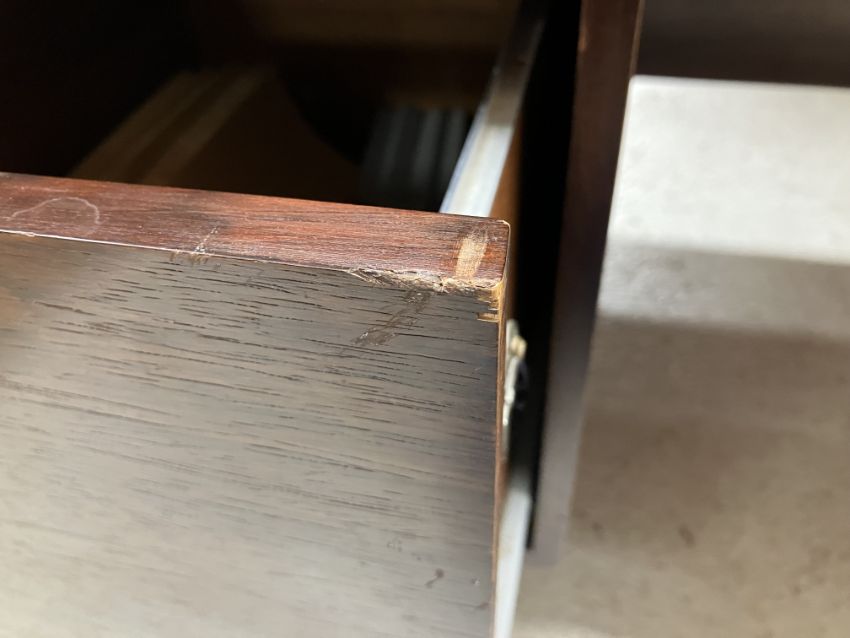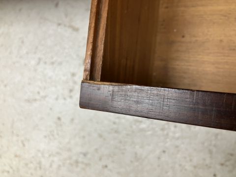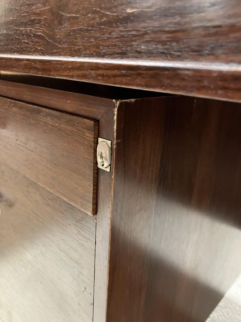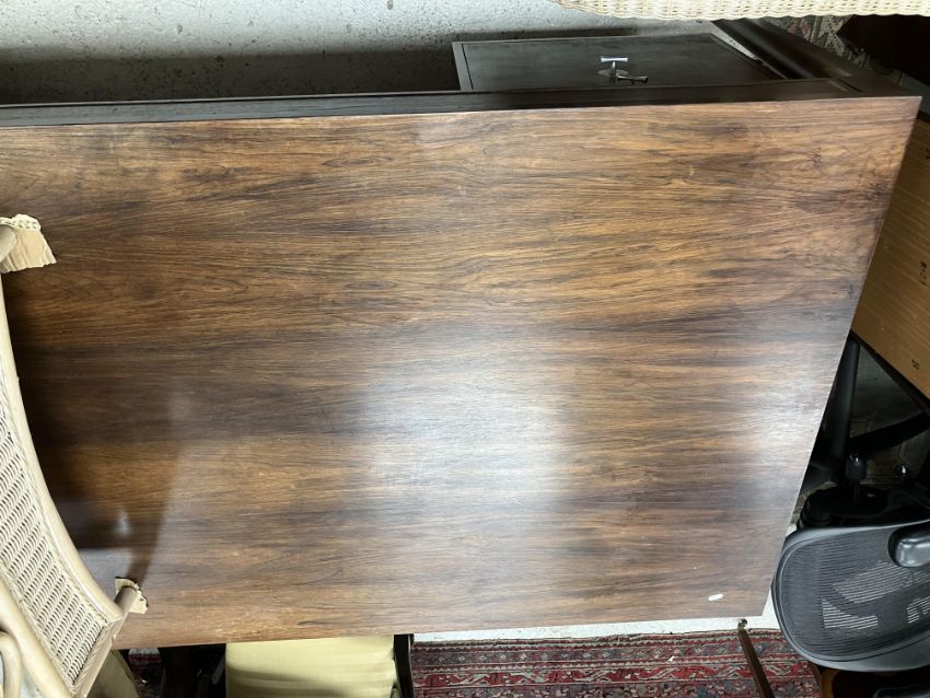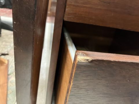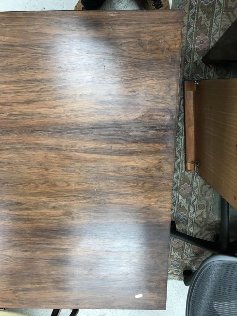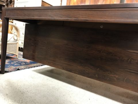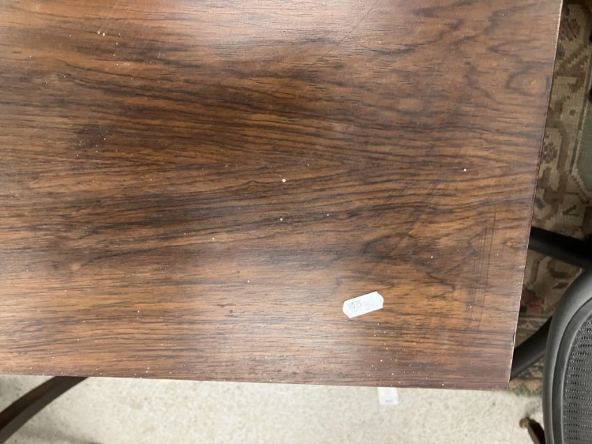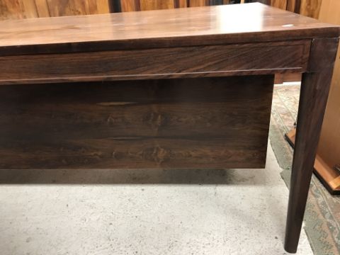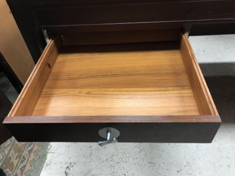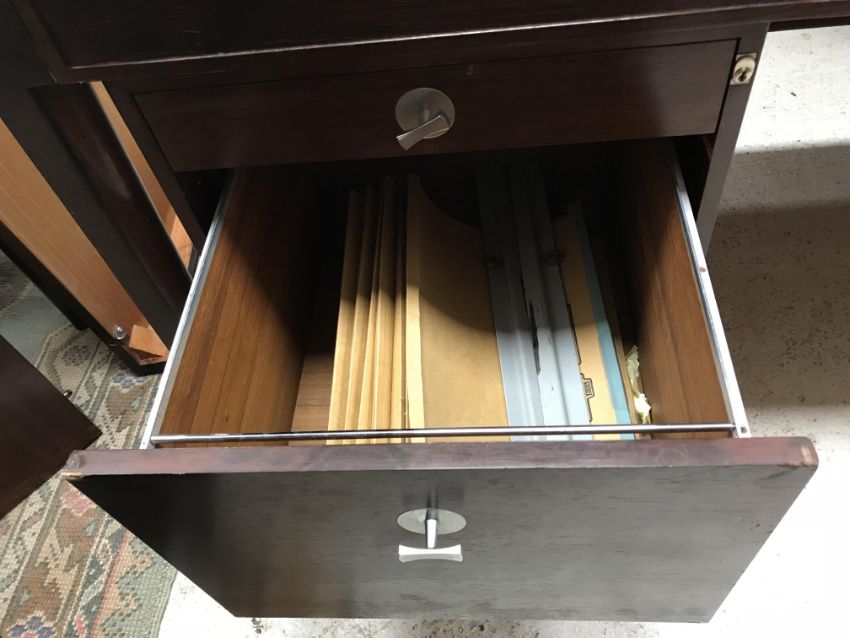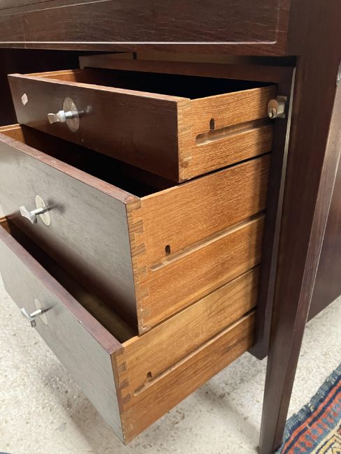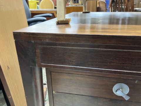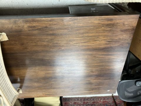 There is significant fading to the top as well as various areas of water marks. One back corner has a large chunk of veneer missing and to the upright of the leg. Another has a small chip missing. Looks as though someone has tried to polish the top at some point - badly as it has wire wool scratch like marks in it. No keys present for the lock. One of the file hanging drawers - the cornice has significant knocks / bruises and needs a little tlc on installing the drawer properly. A couple of the handles are slightly askew. The metal work is in need of a clean. Otherwise general wear and tear conducive with age and use to include knocks, bumps, etc. throughout. Has clearly been used as an office desk for some time. Desk is slightly wobbly - possibly needs joints tightening up a bit. There are some splits to the veneer on the front apron on the left hand side just after the drawers towards the middle and there is a split to the wood on the left hand side where the on pressure from the support post has come through. See images for further details.