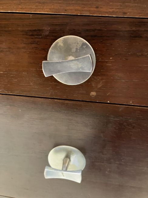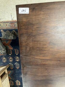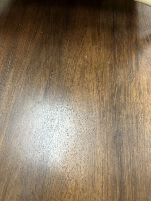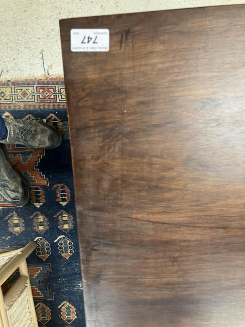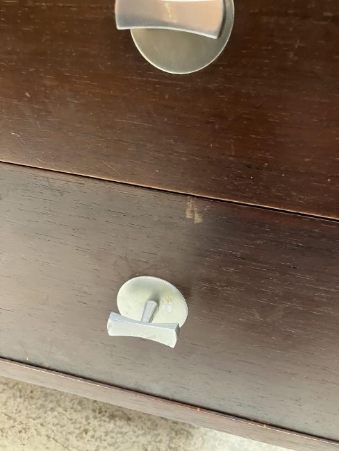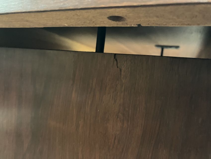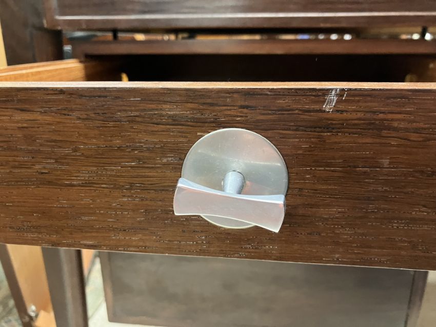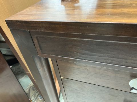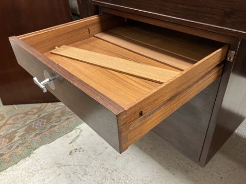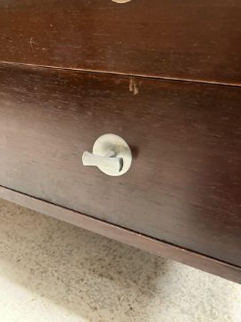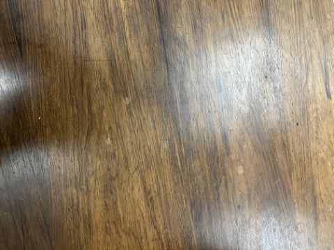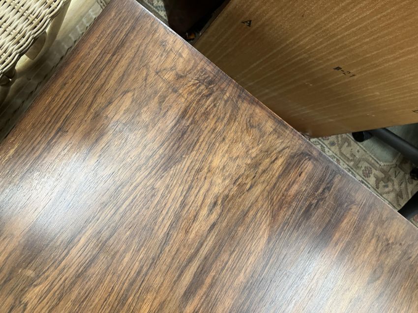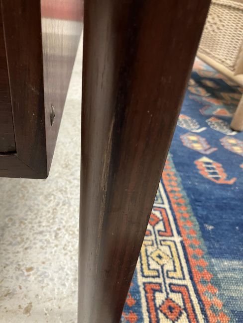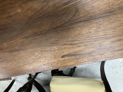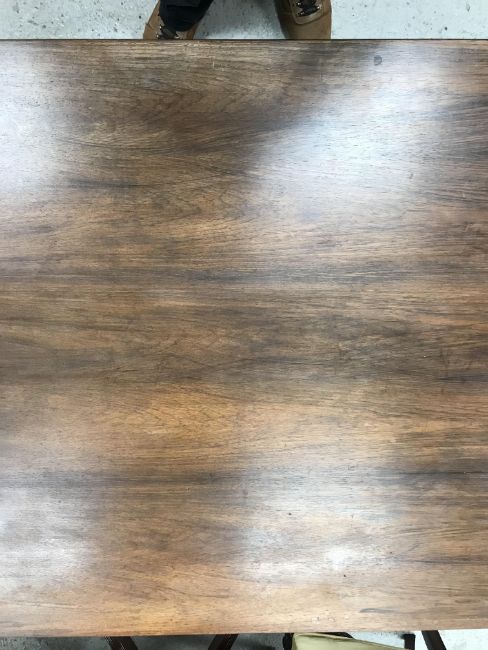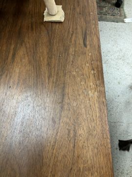There is significant fading to the top as well as various areas of water marks. One back corner has a large chunk of veneer missing and to the upright of the leg. Another has a small chip missing. Looks as though someone has tried to polish the top at some point - badly as it has wire wool scratch like marks in it. No keys present for the lock. One of the file hanging drawers - the cornice has significant knocks / bruises and needs a little tlc on installing the drawer properly. A couple of the handles are slightly askew. The metal work is in need of a clean. Otherwise general wear and tear conducive with age and use to include knocks, bumps, etc. throughout. Has clearly been used as an office desk for some time. Desk is slightly wobbly - possibly needs joints tightening up a bit. There are some splits to the veneer on the front apron on the left hand side just after the drawers towards the middle and there is a split to the wood on the left hand side where the on pressure from the support post has come through. See images for further details.