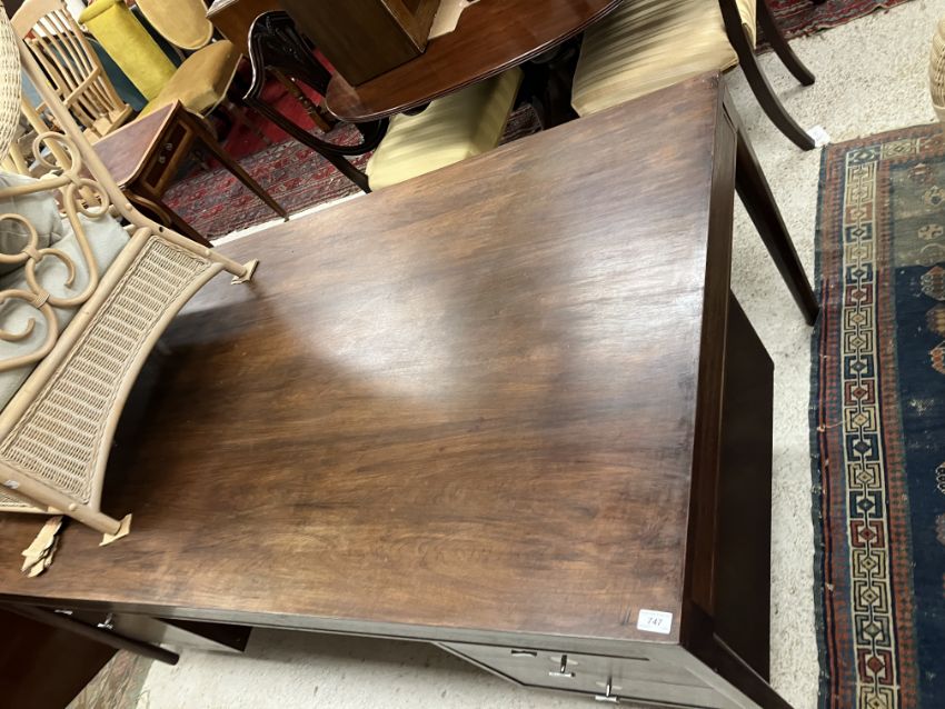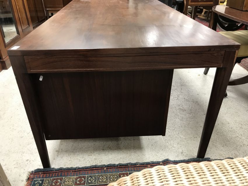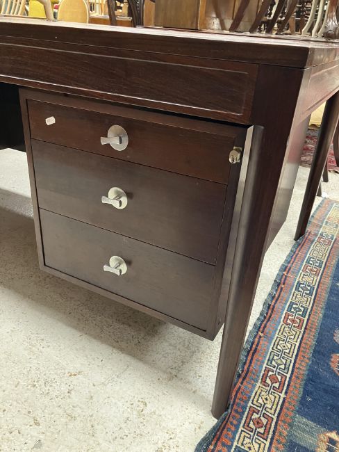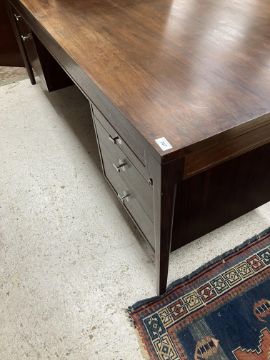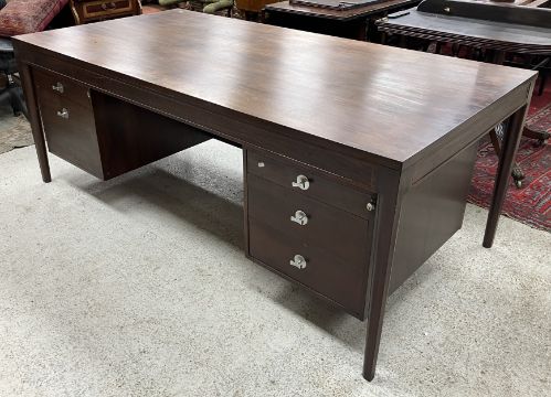 A 1960's Cado Brazilian rosewood veneered double pedestal desk, the plain top over a plain frieze and bank of two drawers and bank of three drawers with chrome T bar handles, flanked by shaped tapering supports, 190 cm wide x 95 cm deep x 71 cm high (CITES Certificate No. 24GBA10C0GPES)