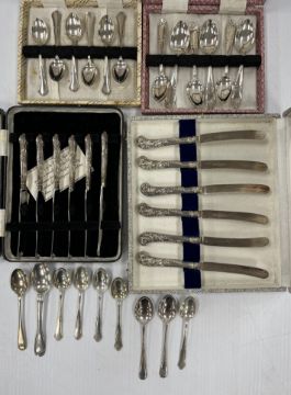 Two sets of six silver handled butter knives together with two cased sets of teaspoons stamped "Sterling" and various other silver and white metal tea spoons, 8 oz