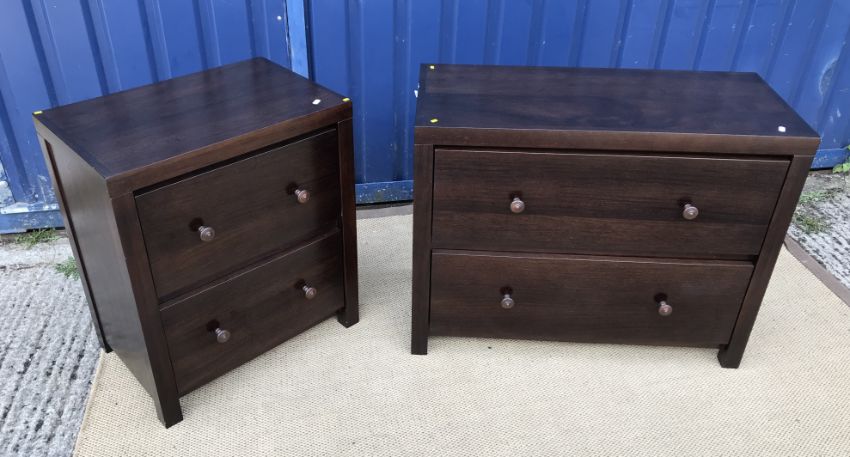 A modern hardwood two drawer chest on square stile supports, 90 cm wide x 40 cm deep x 70 cm high together with a matching smaller chest, 60 cm wide and two small mahogany single drawer side tables, 36 cm wide x 15.5 cm deep x 73.5 cm high and 36 cm wide x 30.5 cm deep x 74 cm high respectively