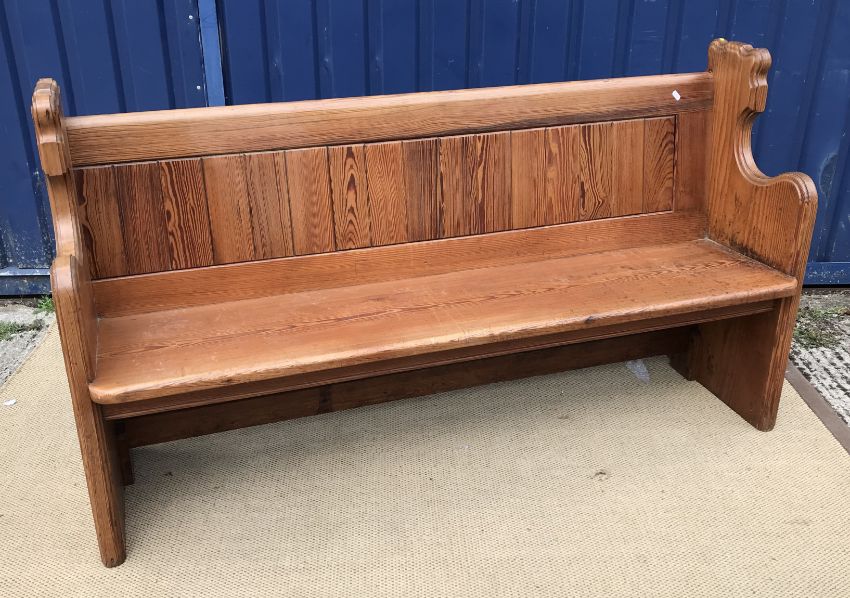 A late Victorian pitch pine chapel pew of typical form with single plank seat and slatted back on moulded and fretwork carved plank end supports with bookshelf verso, 163 cm wide x 54 cm deep x 92 cm high