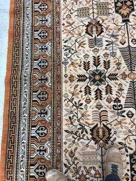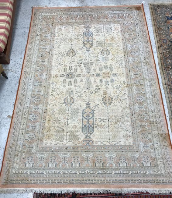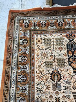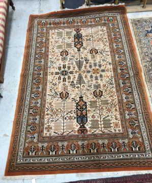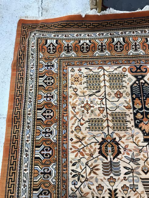 A large Spanish wool Persian design carpet, the central panel set with all over floral and foliate decoration on a beige ground within a stepped terracotta and black geometric patterned border, approx. 297 cm x 195 cm