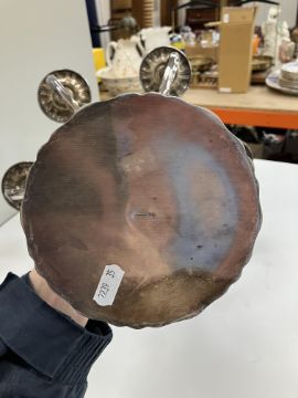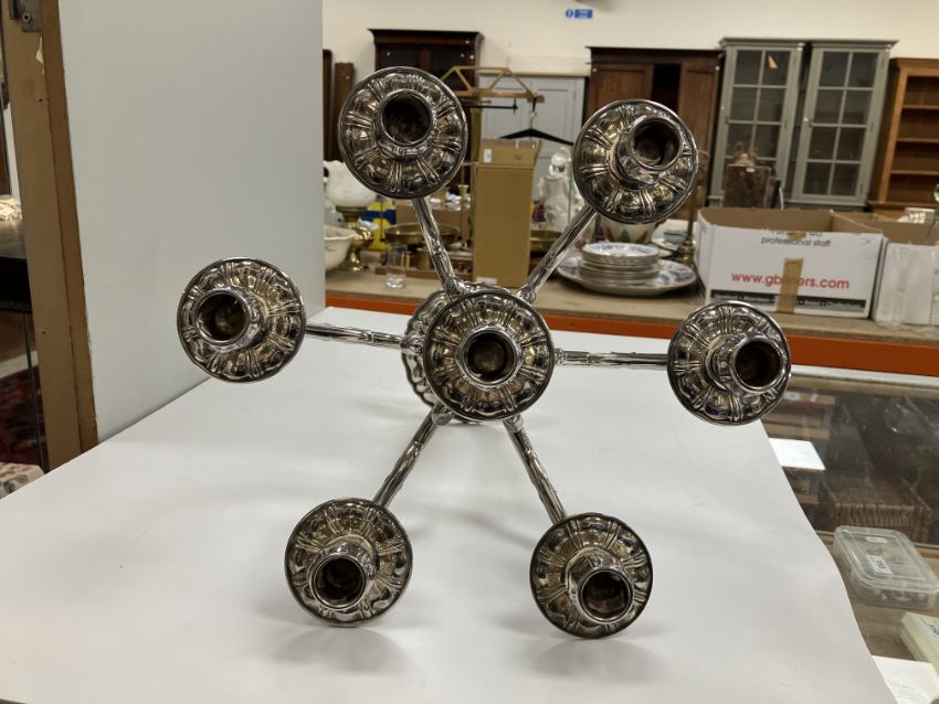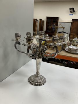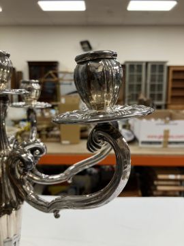 A pair of 20th Century Maltese sterling silver embossed table candelabra, seven light, six branch on flower head bases, 35 cm high, 38.56 oz each CONDITION REPORTS Tarnishing throughout. Some of the candle sconces are slightly askew. One has a seam visible with gap, the other one appears to have had a repair to one arm and around the knop near the base. On the same one, the base has been significantly knocked and crumpled to the underside, the loaded filling is broken, you can hear it rattling if you move the piece. Wear and tear conducive with age and use - see images for more details