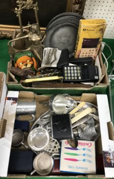 Two boxes of sundry metal wares to include inkstand, pewter plates, wine funnels, etc., together with various vintage calculators and a box of 45s