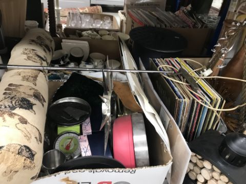 Three boxes of assorted sundry household items to include clocks, china, kitchen items, LPs etc (3)
