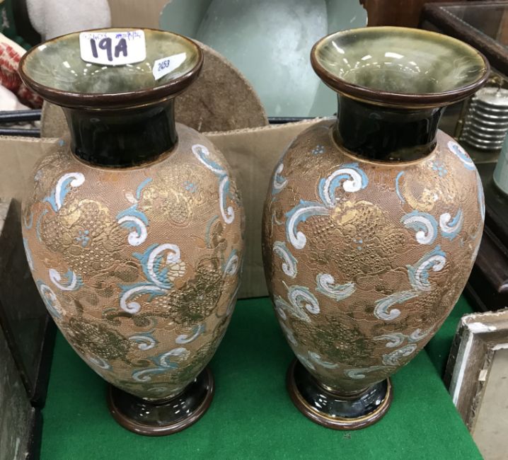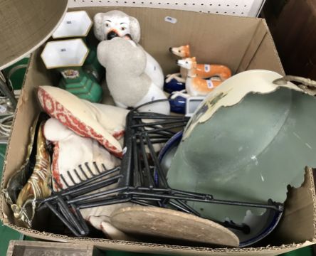 A pair of Doulton Slaters stoneware lace ware vases, together with a box of sundry china and metal wares to include two pairs of Staffordshire type dogs, a pair of brass doorstops in the form of horses, etc. and a large glass vase