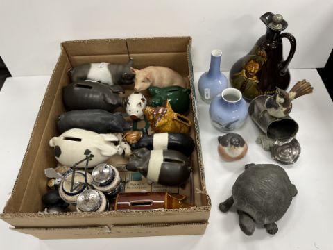 A Royal Doulton Dewar's Whisky flagon of pear form decorated with Ben Jonson, 20 cm high, a circa 1900 spelter inkwell as a tortoise, the shell opening to reveal two recesses, 16.5 cm long, a collection of various other china wares to include two Royal Copenhagen vases, 14 cm and 10 cm high, a Royal Copenhagen figure of a robin, a Japan pattern cruet, a glazed pottery figure of a sparrow upon a tin can, marked "E. Firenz Antic", 14.5 cm high, a collection of pig figures and piggy banks including an Aynsley piggy by John Aynsley 1975, a Rector's Pottery ochre glazed piggy bank, a Don Fine Art Studio pig and sixteen other various pig figures