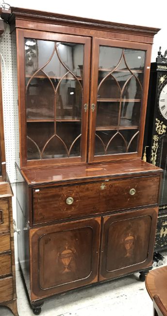 A 19th Century mahogany and inlaid secretaire bookcase, the moulded cornice with inlaid frieze over two astragal glazed doors enclosing two banks of adjustable shelving over a fall front secretaire drawer enclosing a satinwood lined interior with various drawers and pigeonholes, over two cupboard doors enclosing two drawers and an open recess with fittings for adjustable shelving, on turned feet, 108 cm wide x 55 cm deep x 215 cm high