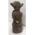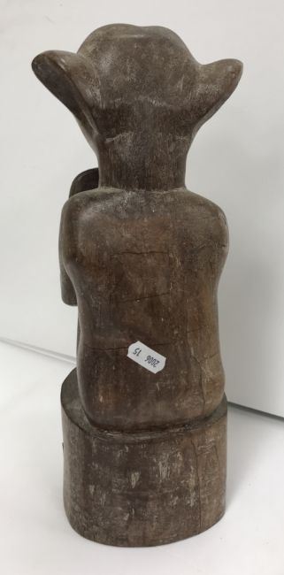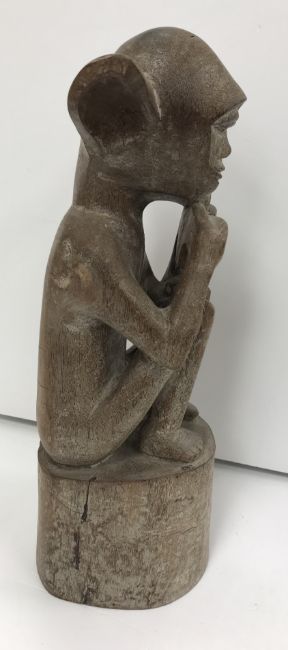 A 1950s Malaysian carved teak figure of a large eared gentleman seated pulling on his beard upon a stump base, 34 cm high