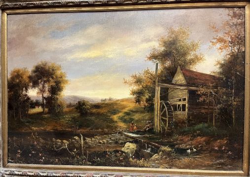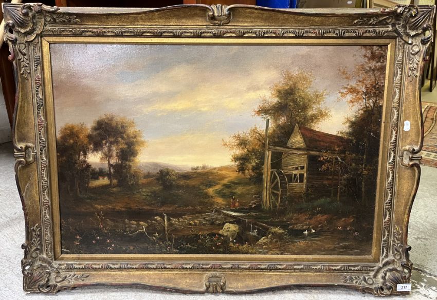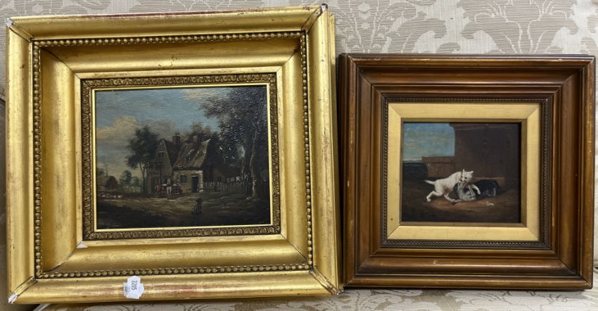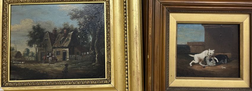 JOHN POLLINS "Watermill by riverside" oil on canvas, 61 cm x 92 cm, a 19TH CENTURY MANNER "Inn with figures in foreground" oil on board, 15.5 cm x 19 cm together with 19TH CENTURY MANNER "Study of dogs fighting", oil on board, 12 cm x 12.5 cm and a print of a young child in the Victorian manner (4)