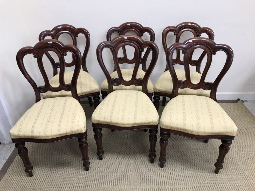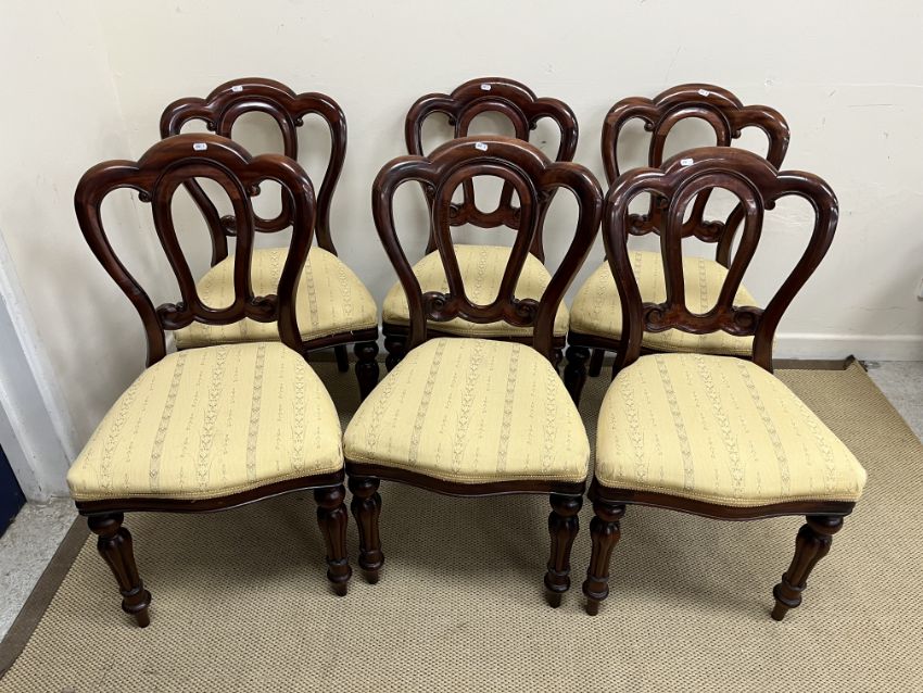 A set of six modern mahogany framed Admiral dining chairs in the Victorian manner, the shaped backs over upholstered seats, on baluster turned and reeded front legs, 48 cm wide x 89 cm high