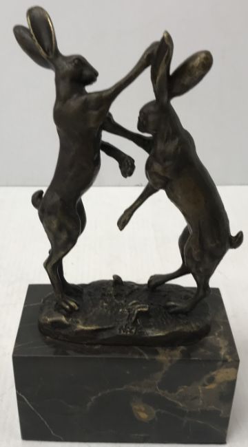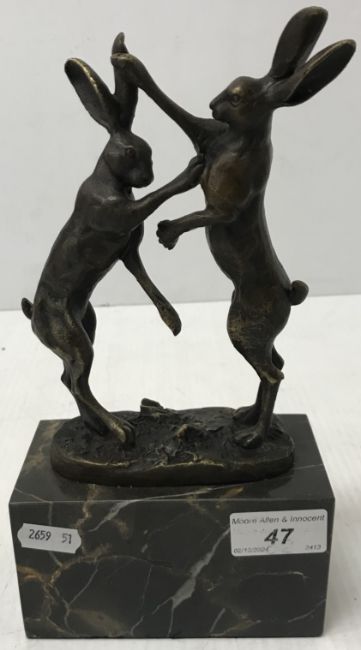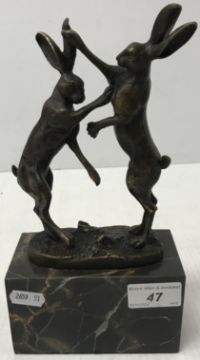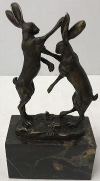 A bronze model of "Two hares boxing", inscribed "Nick", on a marble base, 13 cm wide x 7 cm deep x 25 cm high including base