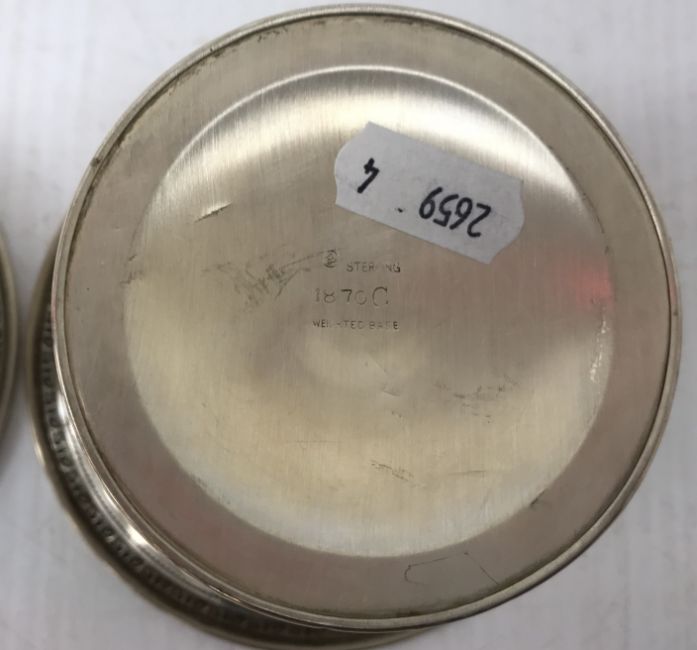 A pair of white metal pedestal dishes with scrolling decoration, stamped "Sterling 1870C Weighted Base" to bases, 12.5 cm diameter x 8 cm high