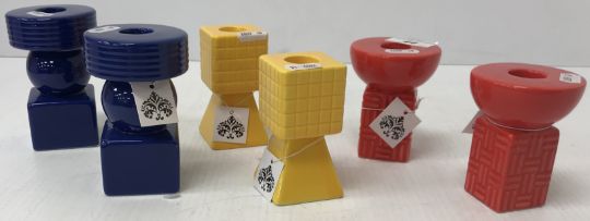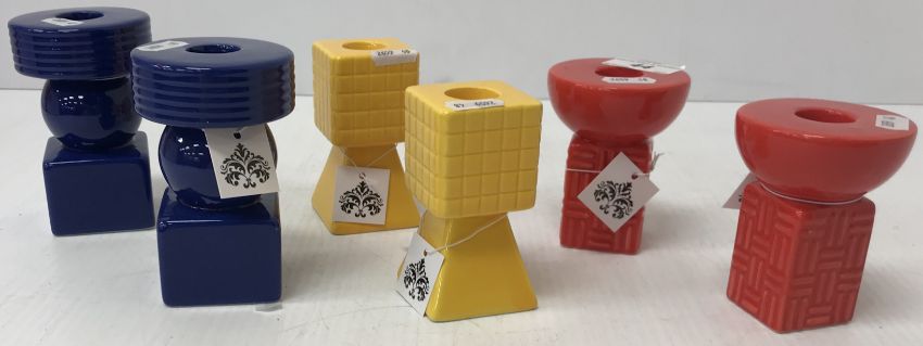 Three pairs of modern geometric candlesticks in primary colours, the tallest 11 cm high (6)