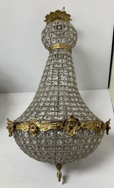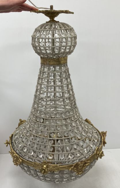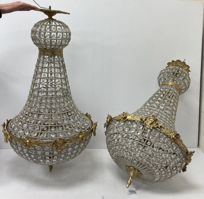 A pair of Empire style glass bead lustre decorated hanging lights, 80 cm long