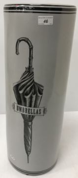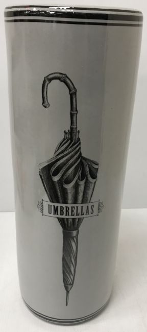 A china umbrella stand in the manner of Fornasetti, the grey ground with black transfer decoration depicting an umbrella and inscribed "Umbrellas", 22 cm diameter x 59 cm high