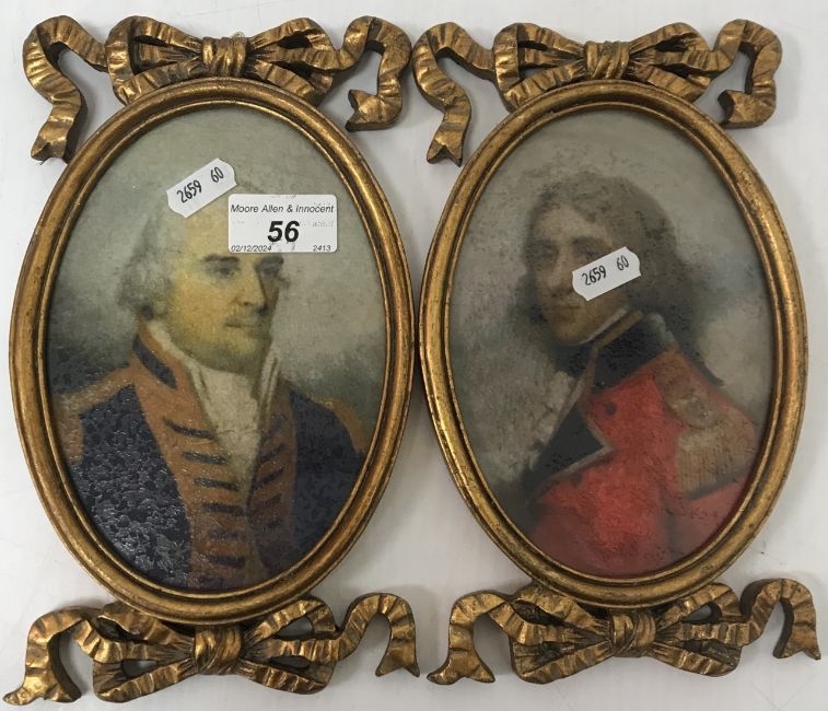 A pair of of modern decorative portraits in the 19th Century manner with ribbon decorated frames, including frames, 24 cm x 14 cm (2)